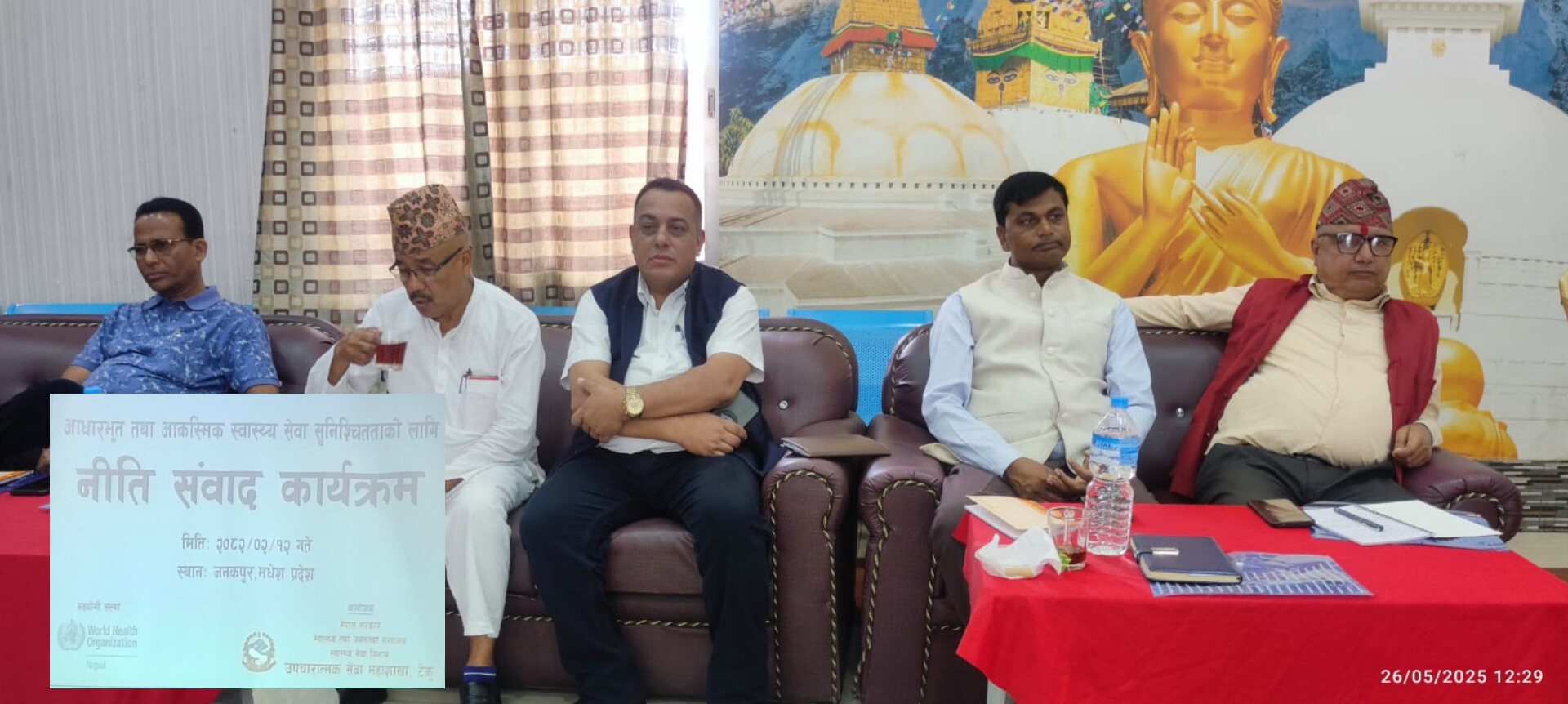 गिरिजानन्द साह/जनकपुरधाम/जेठ १२ गते। स्वास्थ्य तथा जनसंख्या मन्त्रालयअन्तर्गत स्वास्थ्य सेवा विभागको आयोजना र विश्व स्वास्थ्य संगठन (WHO) को सहकार्यमा जनकपुरधाममा “आधारभूत तथा आकस्मिक स्वास्थ्य सेवा सुनिश्चितता” विषयमा केन्द्रित नीति संवाद कार्यक्रम सफलतापूर्वक सम्पन्न भएको छ।