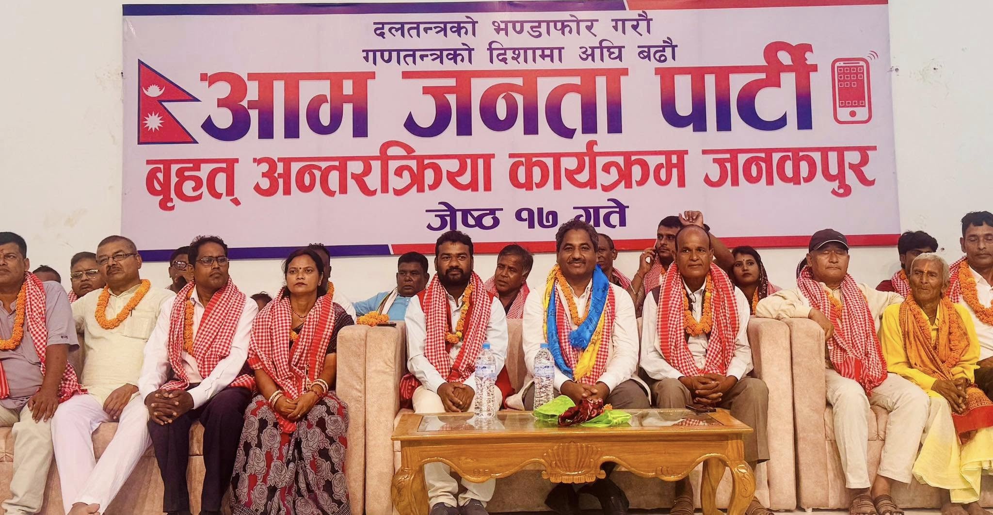 गिरिजानन्द साह/जनकपुरधाम/जेठ १७ गते। ‘दलतन्त्र विरुद्धको भण्डाफोर अभियान’ अन्तर्गत आम जनता पार्टी मधेश प्रदेश कमिटीद्वारा आयोजना गरिएको अन्तरक्रिया कार्यक्रम ‘वर्तमान व्यवस्था: दलतन्त्र कि गणतन्त्र?’ जनकपुरधाममा भव्य रूपमा सम्पन्न भएको छ।