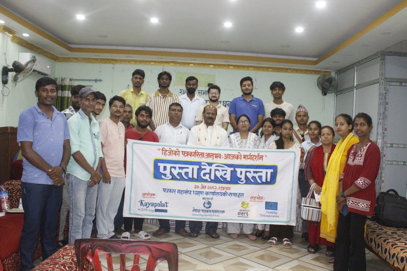 गिरिजानन्द साह/जनकपुरधाम/जेठ ३१ गते। कायापलट संस्थाको आयोजनामा, नेपाल पत्रकार महासंघ धनुषा र इन्टरनेशनल अलर्टको सहकार्य तथा युरोपियन युनियनको आर्थिक तथा प्राविधिक सहयोगमा जनकपुरधाममा “पुस्ता देखि पुस्ता” शीर्षकको कार्यक्रम भव्य रूपमा सम्पन्न भएको छ। कार्यक्रमले पत्रकारिताको परिवर्तनशील यात्रा र नयाँ पुस्तालाई मार्गदर्शन गर्ने उद्देश्यले पुराना अनुभवहरूलाई साझा गर्ने सन्दर्भमा विशेष महत्व राखेको छ।