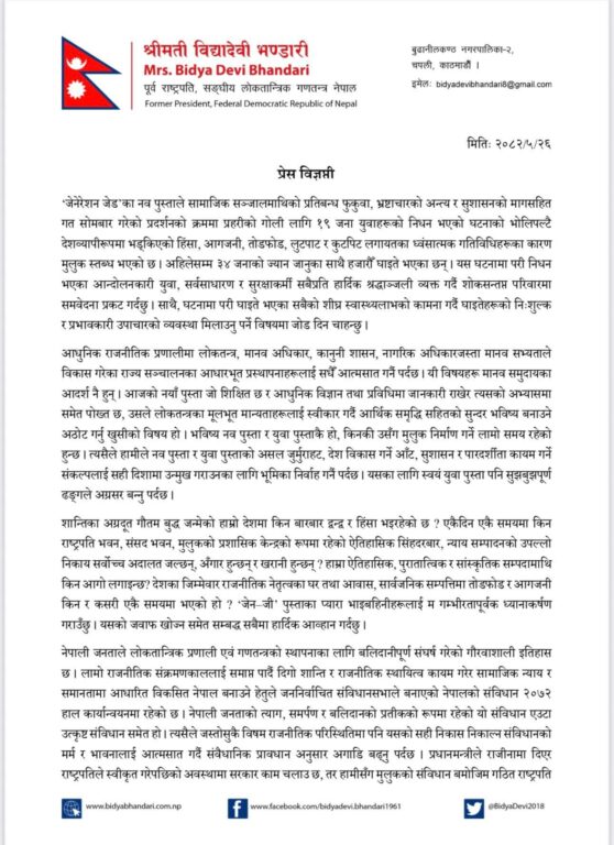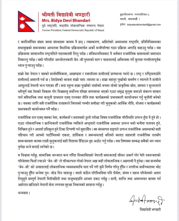 उनले भनेकी छिन्,‘संविधानभित्रबाट नै वर्तमान राजनीतिक समस्याको समाधान निकाल्नुपर्दछ । यसो गरिरहँदा आन्दोलनकारी जेन–जी पुस्ताको माग र चाहनालाई अभिव्यक्त गर्ने कुरामा गम्भीरतापूर्वक ध्यान पुर्याउनुपर्छ ।’