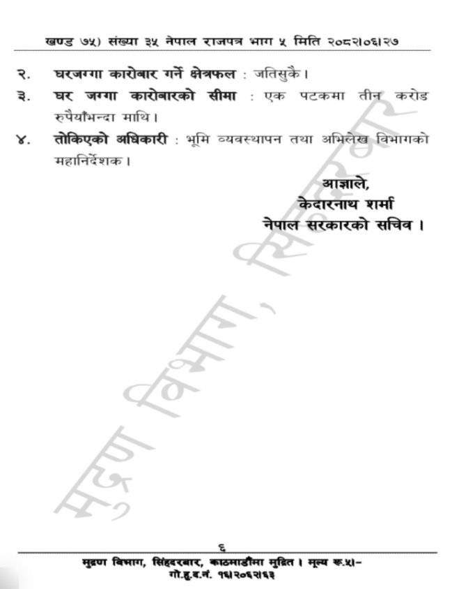 भूमि व्यवस्था सहकारी तथा गरिबी निवारण मन्त्रालयले राजपत्रमा प्रकाशित गरेको सूचनामा मालपोत ऐन, २०३४ को दफा २६ क र २६ख को प्रयोजनका लागि मन्त्रिपरिषद्ले घरजग्गा कारोबारसम्बन्धी नयाँ मापदण्ड जारी गरेको जनाएको छ ।