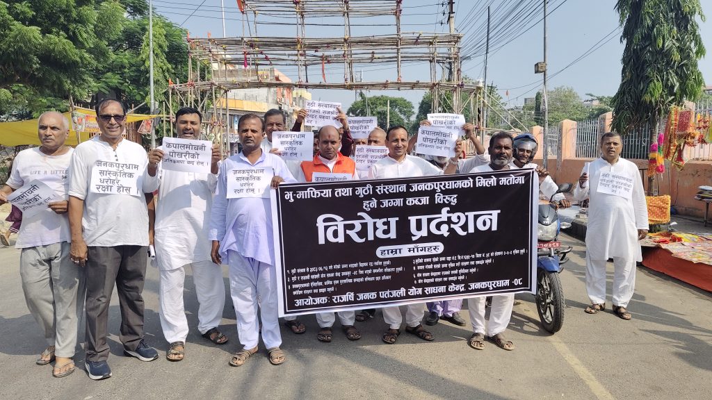 राजर्षि जनक पतंजली योग साधना केन्द्रले गुठी संस्थान जनकपुरधाममाथि भुमाफियासँग मिलेमतो गरी जग्गा कब्जा गर्न खोजेको आरोप लगाउदै विरोधमा प्रदर्शन गरेको हो ।