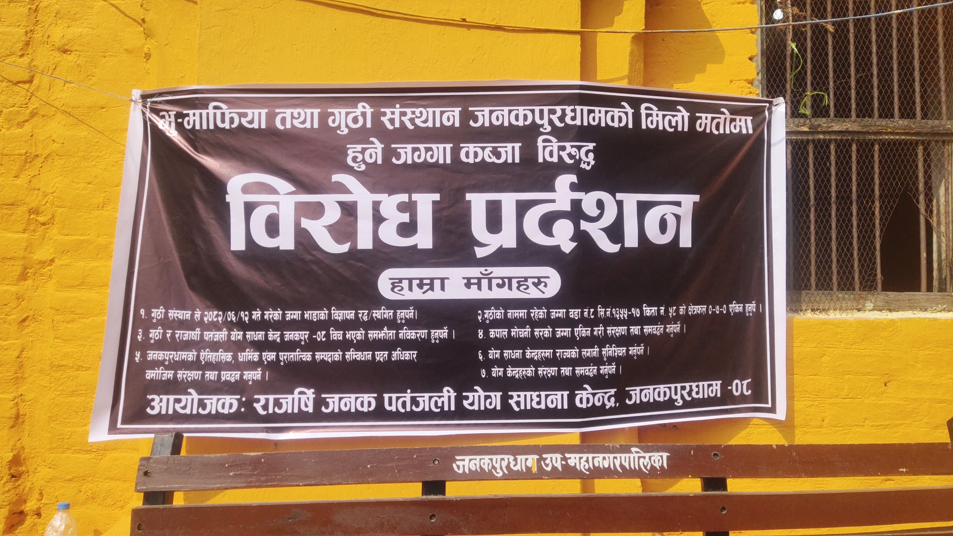 जनकपुरधाम/असोज ३१ गते। राजर्षी जनक योग साधना केन्द्र, जनकपुरधाम–०८ ले भू–माफिया तथा गुठी संस्थान जनकपुरधामको मिलेमतोमा भएको जग्गा कब्जाको विरोधमा प्रदर्शन गरेको छ।