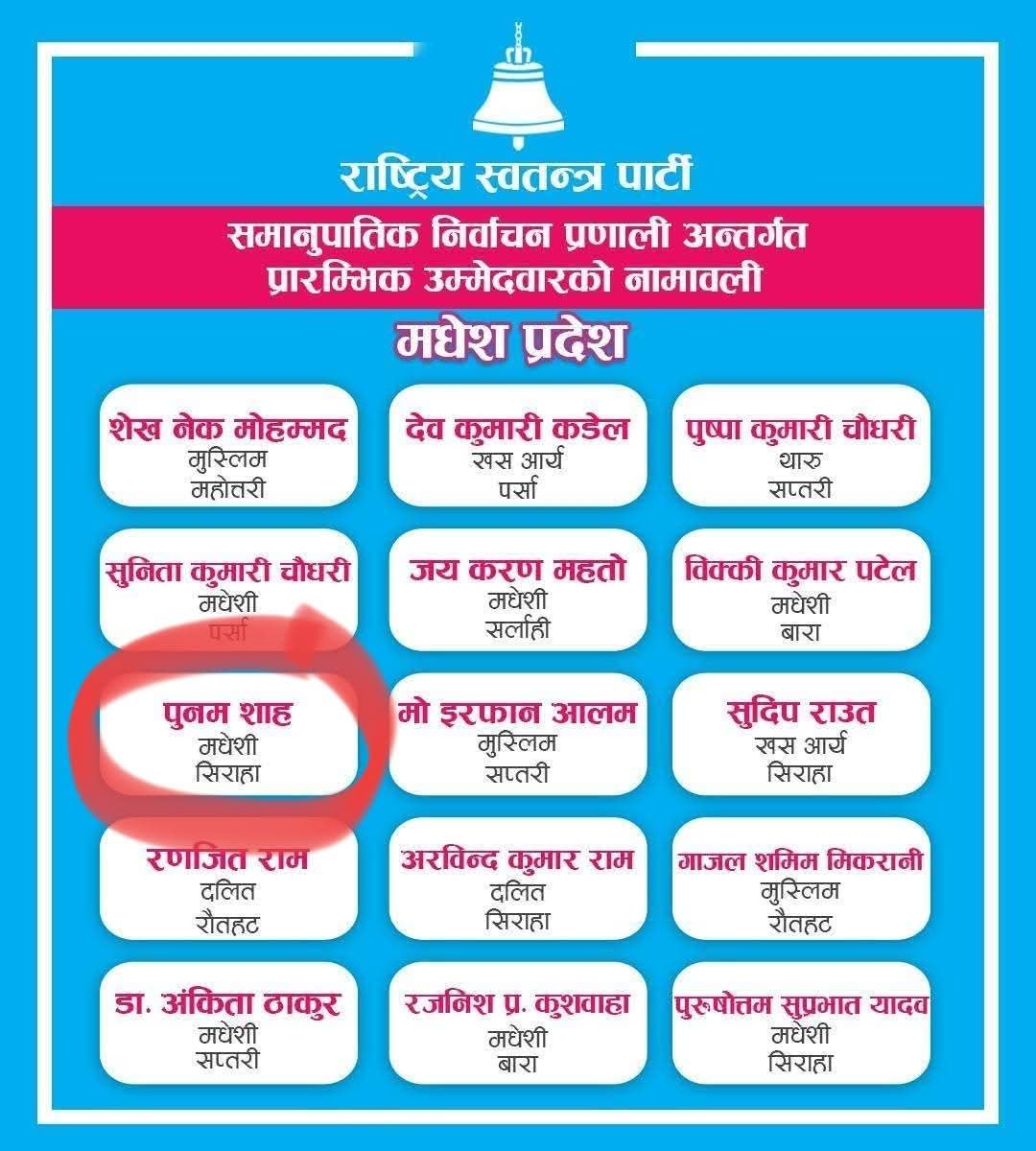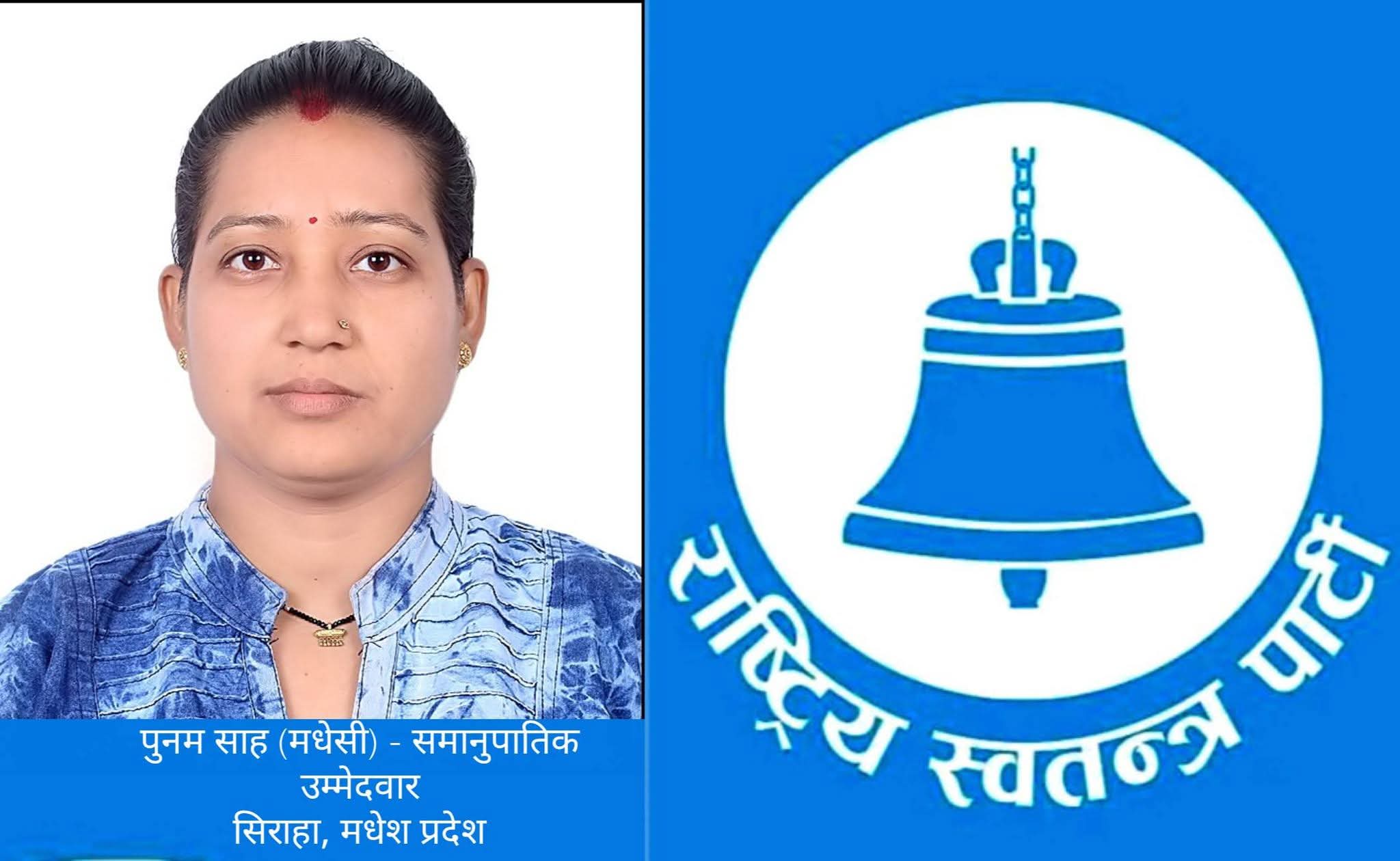 जनकपुरधाम/पुस ५ गते। राष्ट्रिय स्वतन्त्र पार्टी (रास्वपा) ले मधेश प्रदेशबाट समानुपातिक तर्फका उम्मेदवारहरूको प्रारम्भिक नामावली सार्वजनिक गरेको छ । सार्वजनिक सूचीमा पार्टीकी सह–महामन्त्री पुनम साहको नाम पनि समावेश गरिएको छ ।