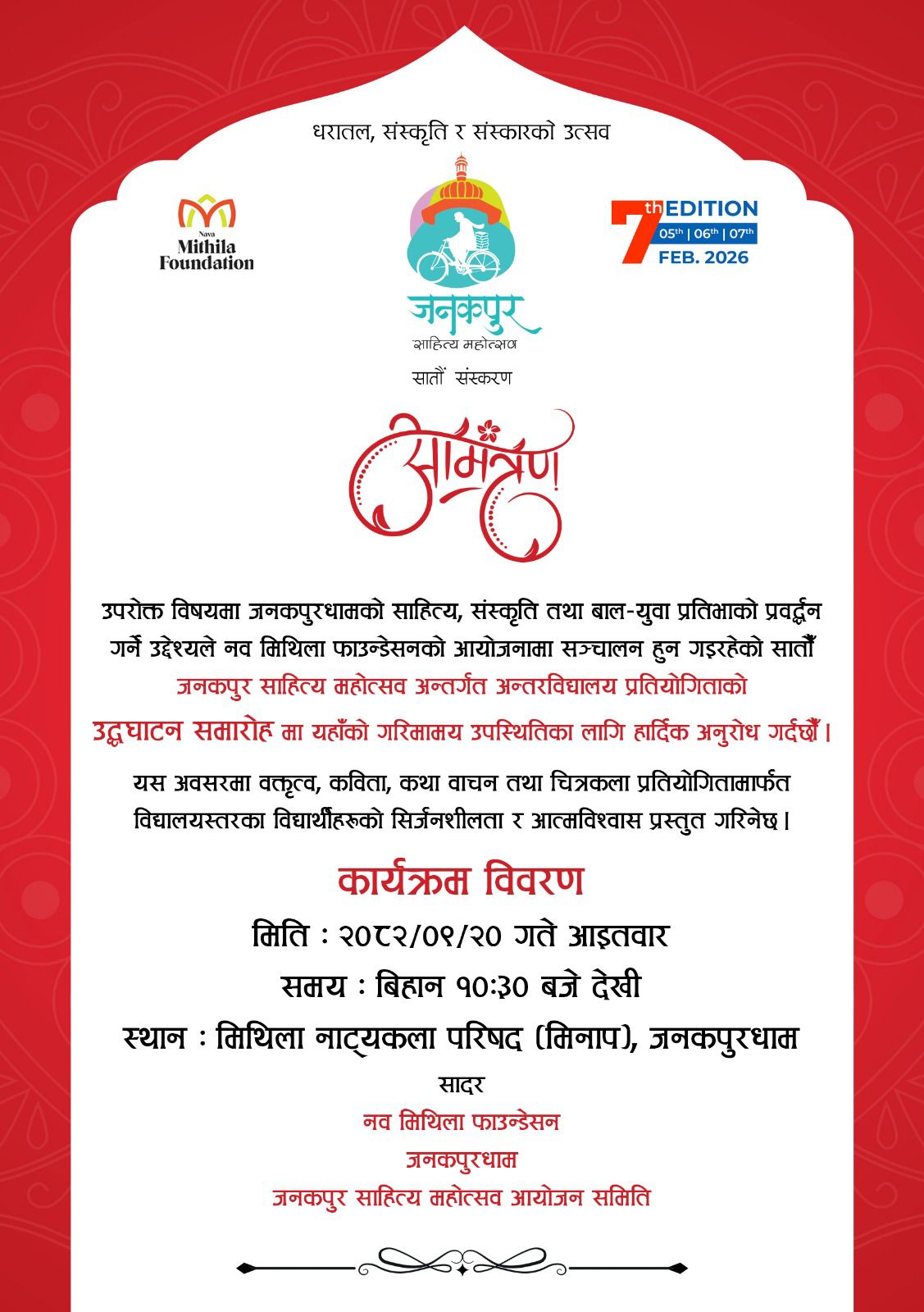 जनकपुरधाम/पुष १९ गते। जनकपुरधामको साहित्य, संस्कृति र सिर्जनशीलताको धरातललाई अझ सुदृढ बनाउने उद्देश्यका साथ सातौँ जनकपुर साहित्य महोत्सवअन्तर्गत अन्तरविद्यालय प्रतियोगिता आइतबार आयोजना हुने भएको छ। नव मिथिला फाउन्डेसनको आयोजनामा हुन लागेको उक्त प्रतियोगितामा बालबालिका तथा युवामा निहित प्रतिभाको पहिचान र प्रवद्र्धनलाई विशेष प्राथमिकता दिइएको आयोजकले जनाएको छ।