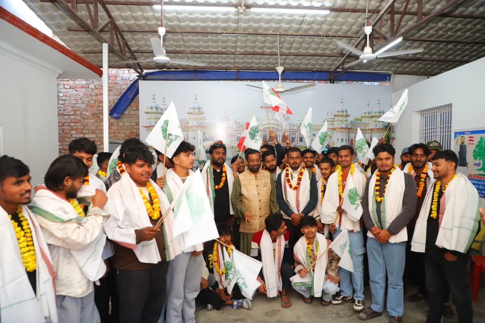 नवप्रवेशी युवाहरूलाई माला लगाएर स्वागत गर्दै पूर्वउपप्रधानमन्त्री एवं नेपाली कांग्रेसका नेता विमलेन्द्र निधिले युवाहरूलाई परिवर्तनको संवाहक बन्न आग्रह गर्नुभयो ।