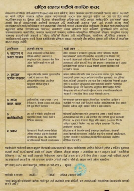 फागुन ३ गते । रवि लामिछाने नेतृत्वको राष्ट्रिय स्वतन्त्र पार्टीले आफ्नो नागरिक करार सार्वजनिक गरेको छ । रास्वपाले यसअघिका चुनावमा धेरैले धेरैपटक वाचा गरेको तर पूरा नगरेको उल्लेख गर्दै आफ्नो दलले जनतासँग प्रतिज्ञाको करार गर्ने जनाएको छ । उक्त करार यही फागुन ७ गते विस्तृत रुपमा कर्णालीबाट सार्वजनिक गरिने जनाएको छ ।