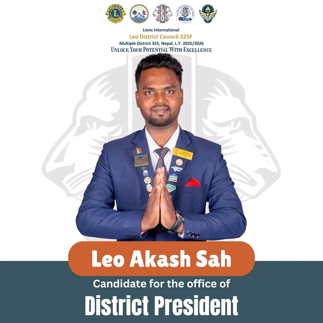 २०८३ वैशाख ५ गते काठमाडौंमा हुने चौथो जिल्ला लियो सम्मलेनबाट लियो डिस्टटिक काउन्सिल ३२५ एफ नेपालको अधिवेशनमा जनकपुरधामका लियो अकास साह, अध्यक्ष पदका उम्मेदवार छन् ।